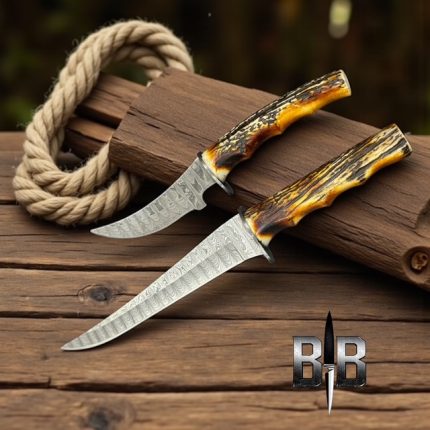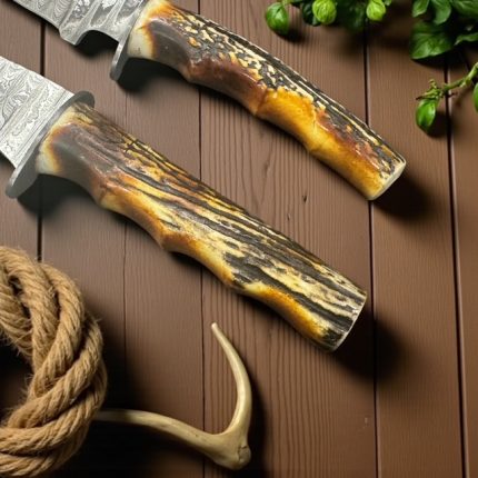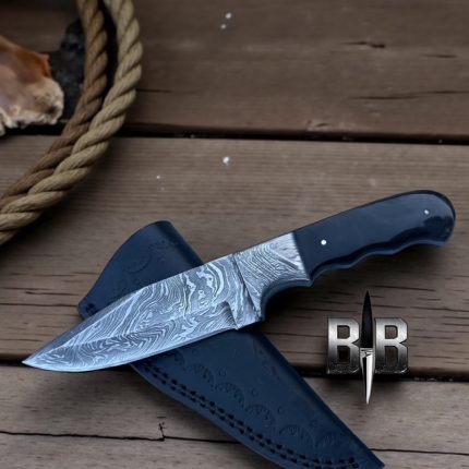 Custom made Damascus steel camping knife high carbon steel with buffalo horn and pins
